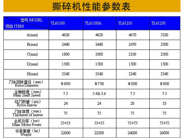 說明: 1.動刀標準厚度為75mm,也有50、100mm,可根據(jù)物體破碎后顆粒小來刀體。 2.動刀為單爪刀體,如需雙爪刀體及多爪刀體的用戶可與業(yè)務(wù)部聯(lián)系。 3.TL61180A是在TL61180基礎(chǔ)上作的改進,減速機機座號改,轉(zhuǎn)速降低,扭矩增。