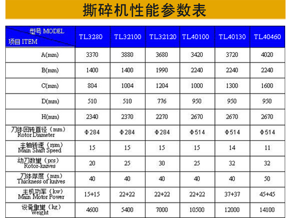 TL32 series Double Shaft Shredder Automatic control by microcomputer (PC),with functions of start,stop,reverse,overload automatic reverse,feature return an over-loading returns automatism,with characteristics of big torque in low speed ,low noise .Suitable for crushing the solid material like television,washing machine,shell of refrigerator ,medium size pipe,pipe fittings,forklift splint,tires,packing barrel.